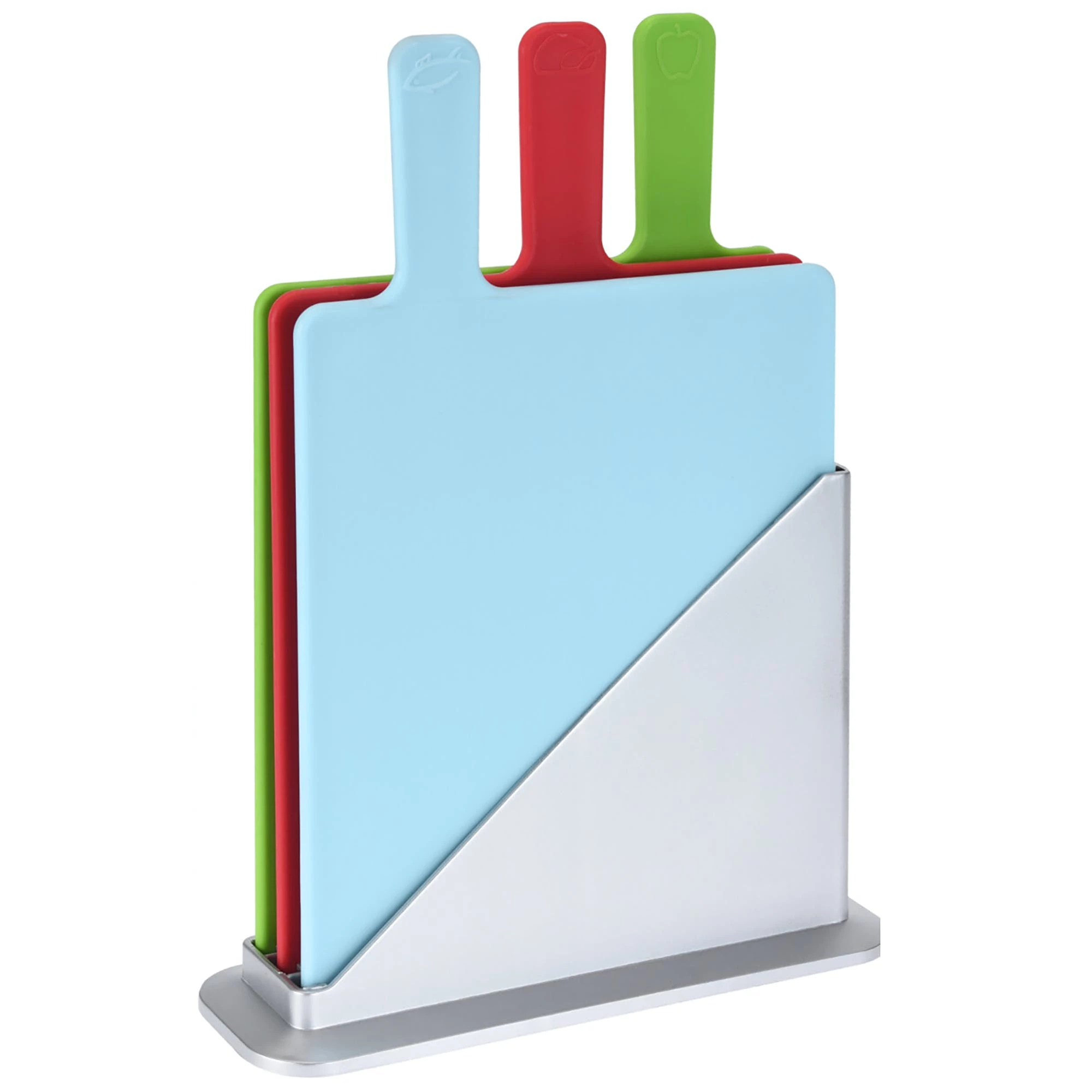 Unsere Schneidebretter sind aus BPA-freien Kunststoffen hergestellt. Die drei verschiedenen, farbenfrohen Schneidbretter machen Lust und Laune und möbeln Ihre Küche richtig auf. Die Oberfläche ist glatt und messerschonend gearbeitet, der stilvolle silberfarbene Metall-Ständer paßt nahezu zu jedem Interieur, somit haben Sie die farbigen Bretter immer griffbereit. Die Schneidebrettchen sind langlebig und können problemlos in der Spülmaschine gereinigt werden.