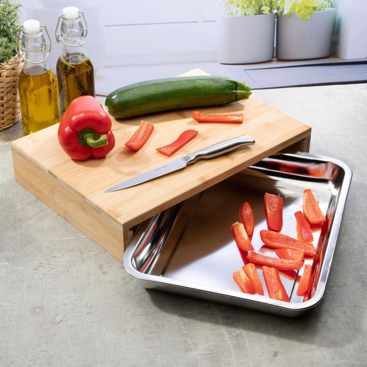 Effizient und hygienisch. Mit diesem Schneidebrett aus Bambus lassen sich Lebensmittel schnell und clever verarbeiten.