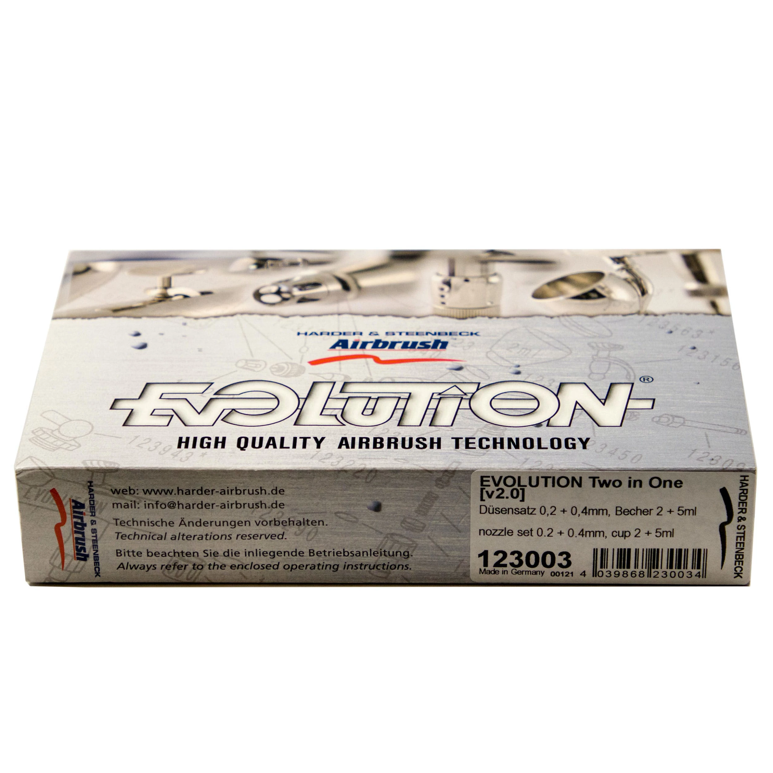 Die Two in One ist baugleich mit dem Evolution Solo Modell, jedoch mit zweitem Düsensatz und Farbbecher im Lieferumfang ausgestattet.