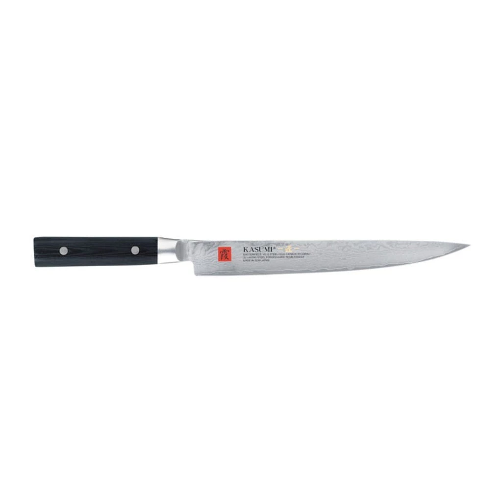 Fleischmesser gehören seit langer Zeit zum festen Bestandteil der Ausrüstung eines jeden Profikochs. Mit dem KASUMI Masterpiece Fleischmesser 24 cm (MP-09) wurde der Masterpiece Serie neben dem kleinen (KASUMI Masterpiece Fleischmesser 20 cm (MP-08)) noch ein großes Fleischmesser hinzugefügt. Mit seiner herausragenden Klingenlänge von 24 cm lassen sich auch die besonders großen Fleischteile in die gewünschte Stückgröße bringen. Das MP-09 hat wie alle anderen Küchenmesser der Masterpiece Serie hervorragende innere und äußere Werte. Dazu zählt neben dem sehr angenehm zu greifenden Leinen-Hartharz-Griff auch die formvollendende Klinge aus VG 10 cobalt high carbon Damaszener Stahl, der hier 32-lagig geschmiedet ist. Mit diesem Messer fällt es schwer, nach dem Schneiden der Steaks aufzuhören und nicht gleich das ganze Fleisch in (Goulasch-) Würfel zu zerteilen. Mit dem MP-09 macht das Fleischschneiden einfach richtig Freude.