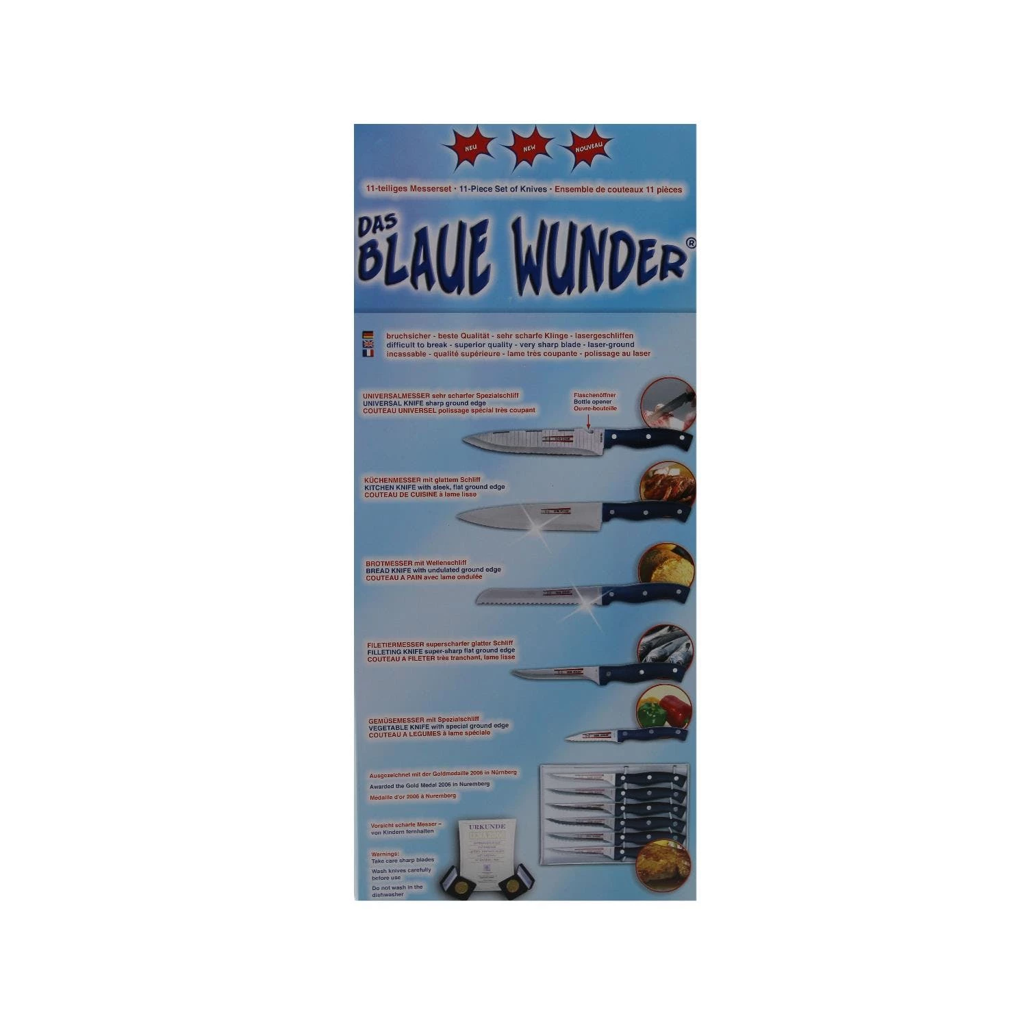 “Das Blaue Wunder” 11-teiliges Messer – Set besteht aus einem Universalmesser, Küchenmesser, Brotmesser, Filetiermesser und Gemüsemesser. Zu diesem Set sind weitere sechs Steakmesser inbegriffen.