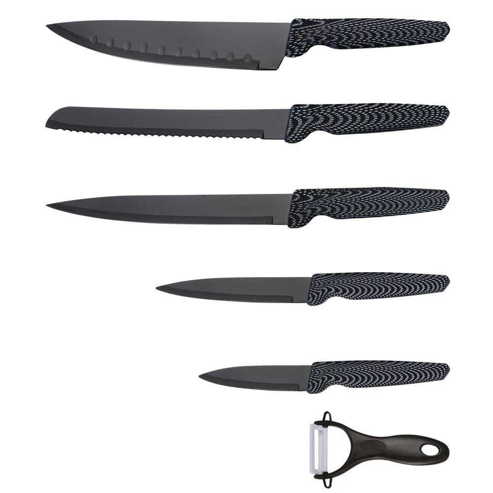 6-teiliges Messerset mit Klingen aus antihaftbeschichtetem Edelstahl und Griffen aus Kunststoff. Set beinhaltet: Kochmesser (Länge 20 cm, Dicke 1,5 mm), Brotmesser (Länge 20 cm, Dicke 1,5 mm), Fleischmesser (Länge 20 cm, Dicke 1,5 mm), Universalmesser (Länge 15 cm, Dicke 1,2 mm), Gemüsemesser (Länge 9 cm, Dicke 1,2 mm) und Schäler (Länge 9 cm).