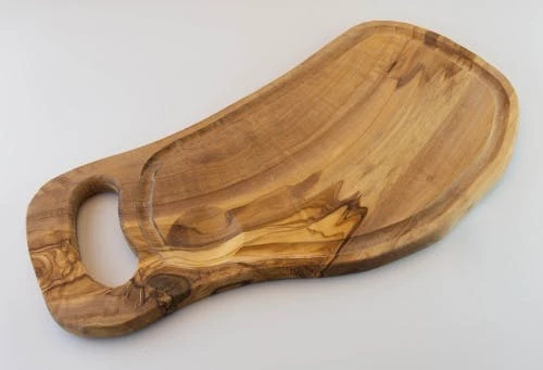 Dieses Servierbrett mit Griff und Saftrille aus Olivenholz bietet durch die Eigenschaft des Holzes verschiedene Merkmale auf.