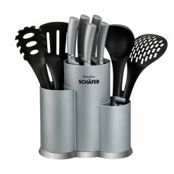 11-tlg. Messerblock Metallic Silver • Beschichteter Klingenstahl • Extrem strapazierfähig • Küchenhelfer aus Nylon • Ergonomische Softgriffe • Praktischer Messerblock mit Bürstenensatz