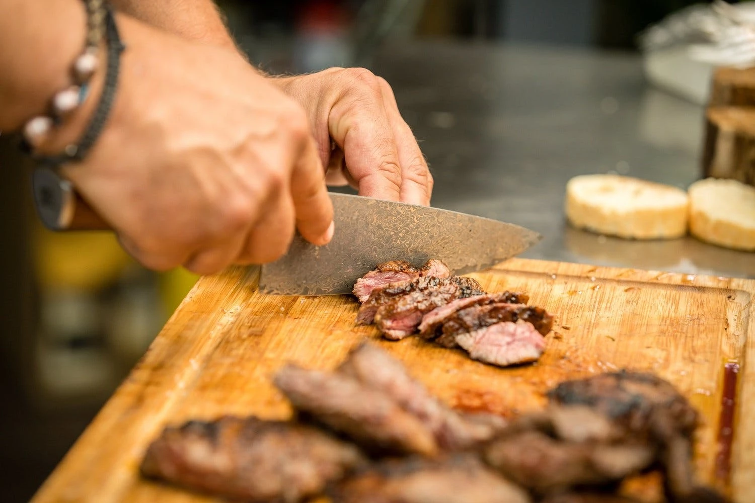 Schneidebrett Bambus 38 x 22cm – antibakterielles Holz – Edelstahlgriff – mit Saftrinne