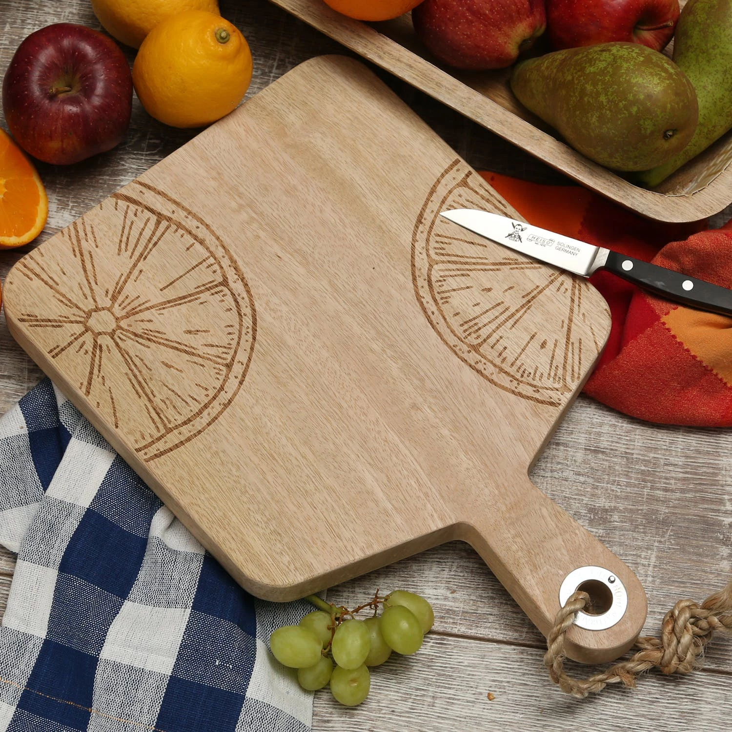 Schneidebrett – Vesperbrett – Mangoholz – Kordel – L: 38cm – Zitronenmotiv halbiert – natur