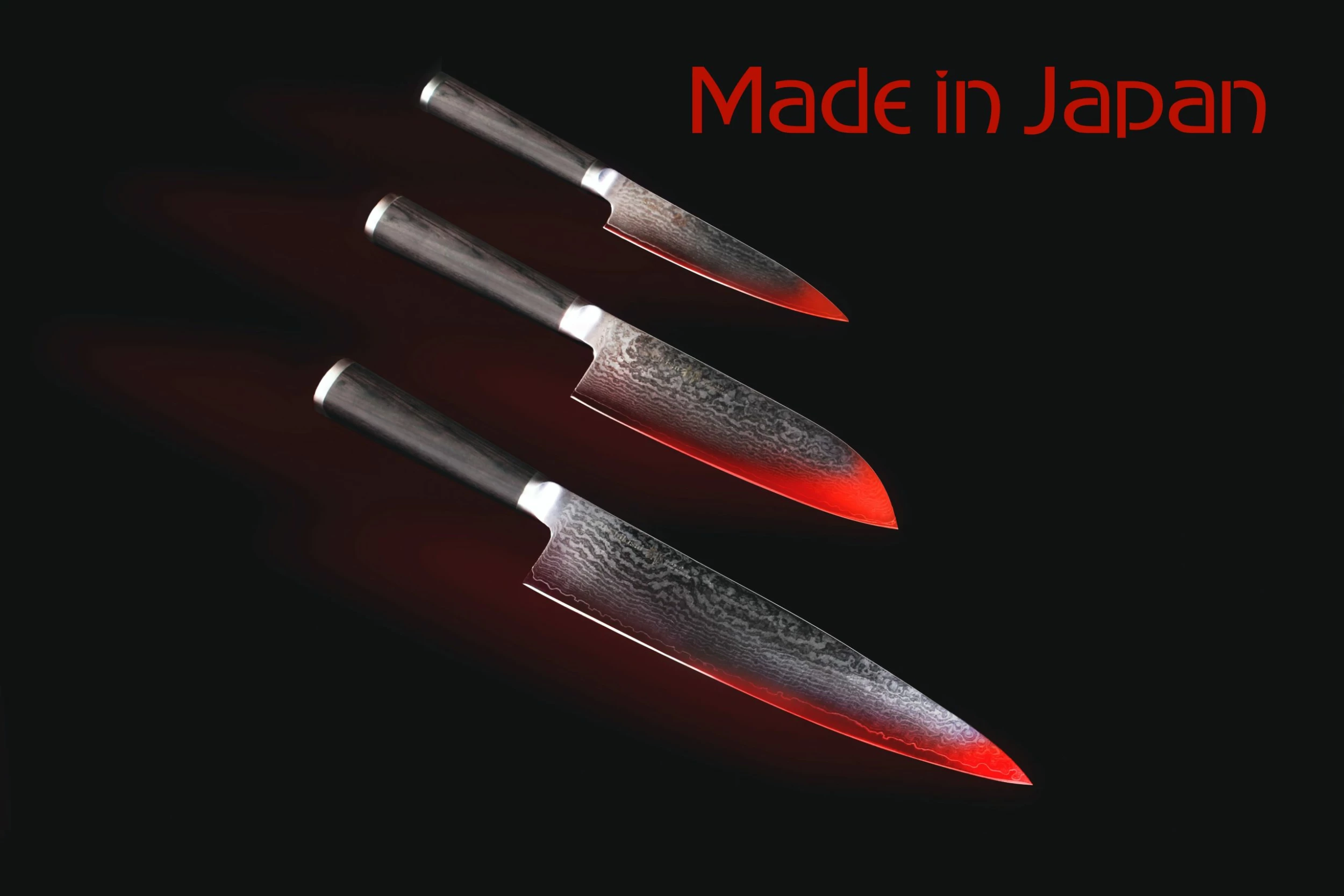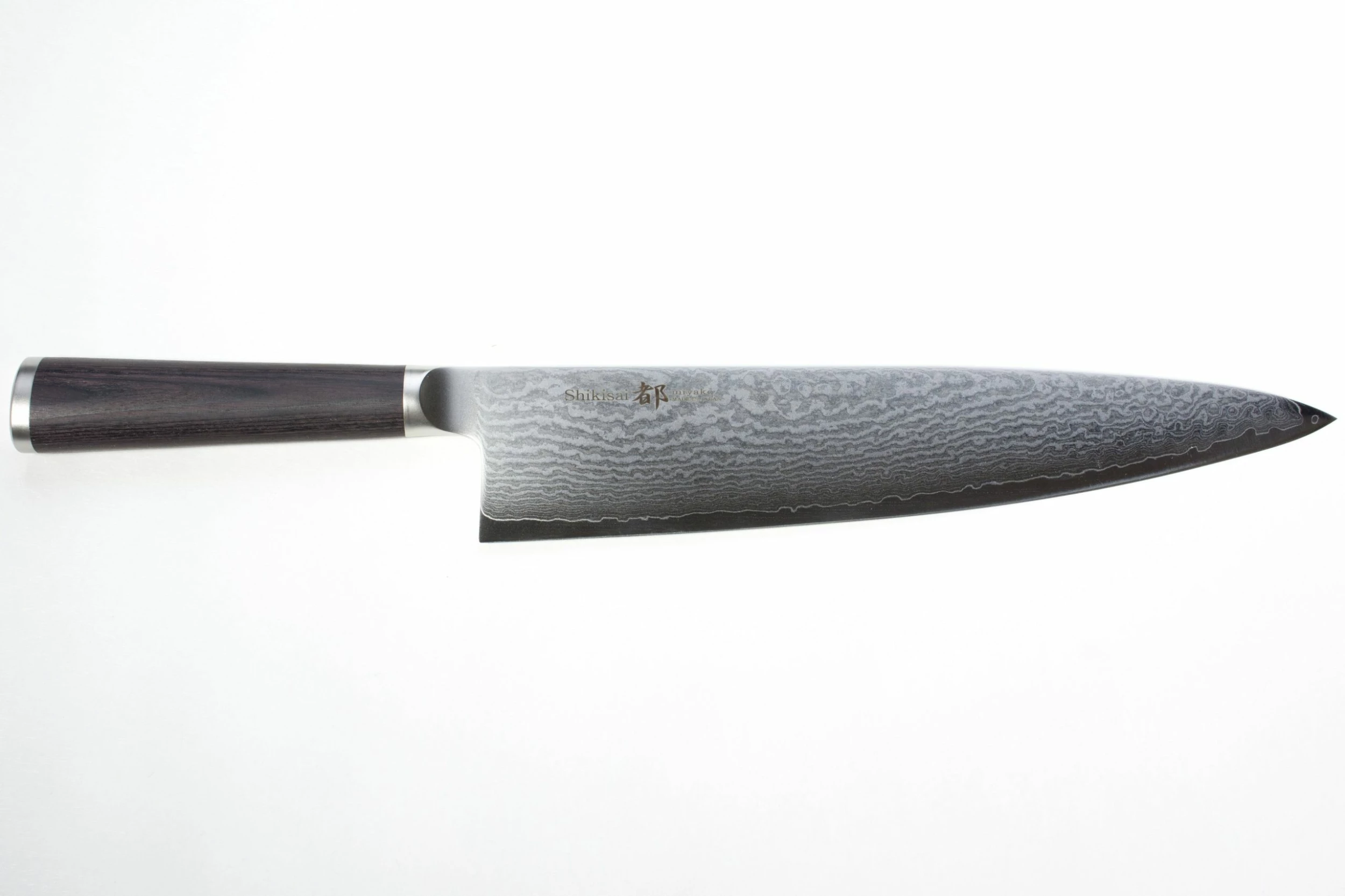 Kochmesser, Chef Knife Klingenlänge: 21 cm, Schneidlage: AUS8 Stahl, 33 Lagen Damaszener Stahl, Grifflänge: 13,2 cm, Klingenhöhe am Griff: 4,6 cm, Gewicht: 170 g, Klingenhärte: 61 HRC, Schliff: beidseitig, Ergonomisch geformter Handgriff aus Schichtholz Pakka, Handgefertigt in Seki Japan, Das Messer wird in einer hochwertigen Geschenkverpackung geliefert.