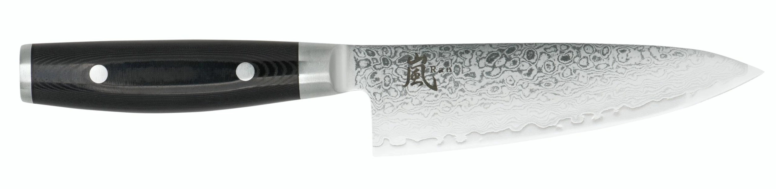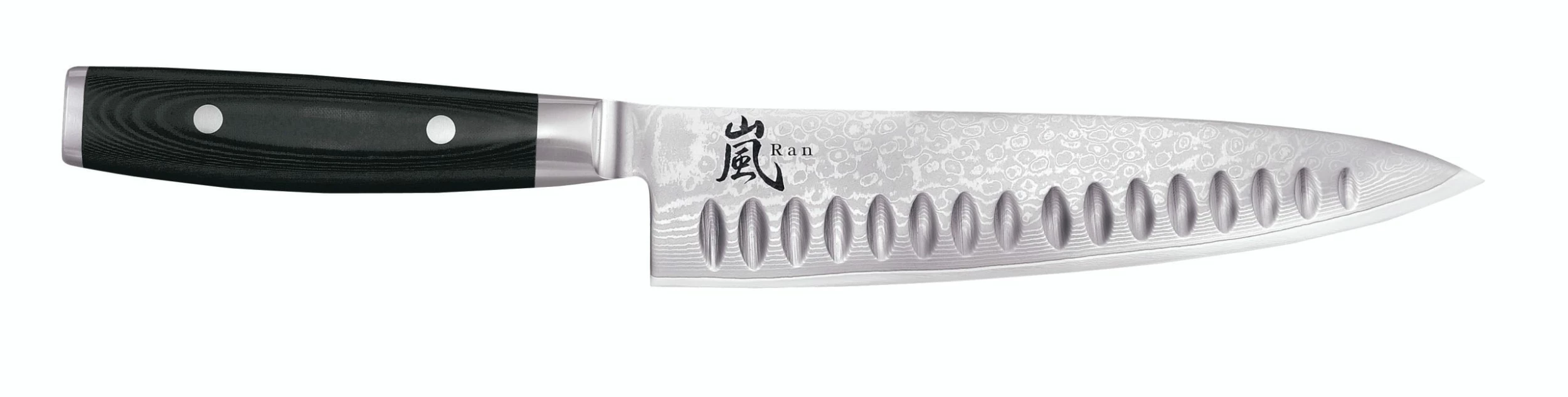 Der Griff wurde aus FDA-genehmigtem, schwarzen Mikarta, hergestellt aus Leinen und Epoxidharz, gefertigt. Dieses Griffmaterial sieht sehr hochwertig und sieht schön aus, ist enorm widerstandsfähig und bleibt auch bei professioneller Anwendung Jahrzehnte unverändert. Mit zwei Edelstahlnieten werden die Griffschalen am Edelstahlkern befestigt. RAN 69-lagige Damastmesser sind sehr hygienisch und einfach sauber zu halten. Der ergonormische Griff sorgt für ein besonders bequemes Handling.