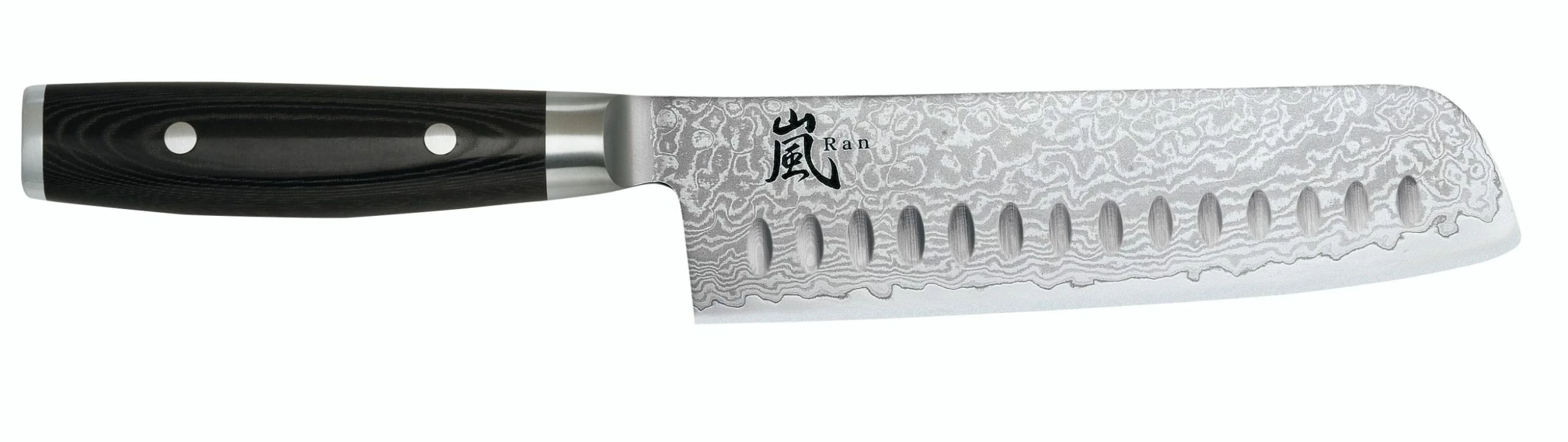 Der Griff wurde aus FDA-genehmigtem, schwarzen Mikarta, hergestellt aus Leinen und Epoxidharz, gefertigt. Dieses Griffmaterial sieht sehr hochwertig und sieht schön aus, ist enorm widerstandsfähig und bleibt auch bei professioneller Anwendung Jahrzehnte unverändert. Mit zwei Edelstahlnieten werden die Griffschalen am Edelstahlkern befestigt. RAN 69-lagige Damastmesser sind sehr hygienisch und einfach sauber zu halten. Der ergonormische Griff sorgt für ein besonders bequemes Handling.